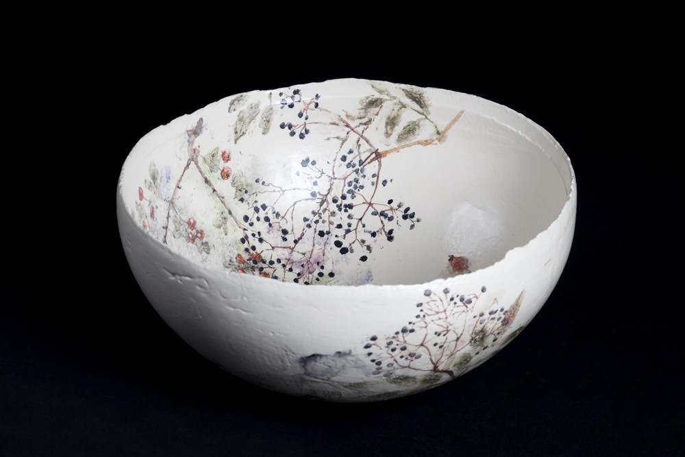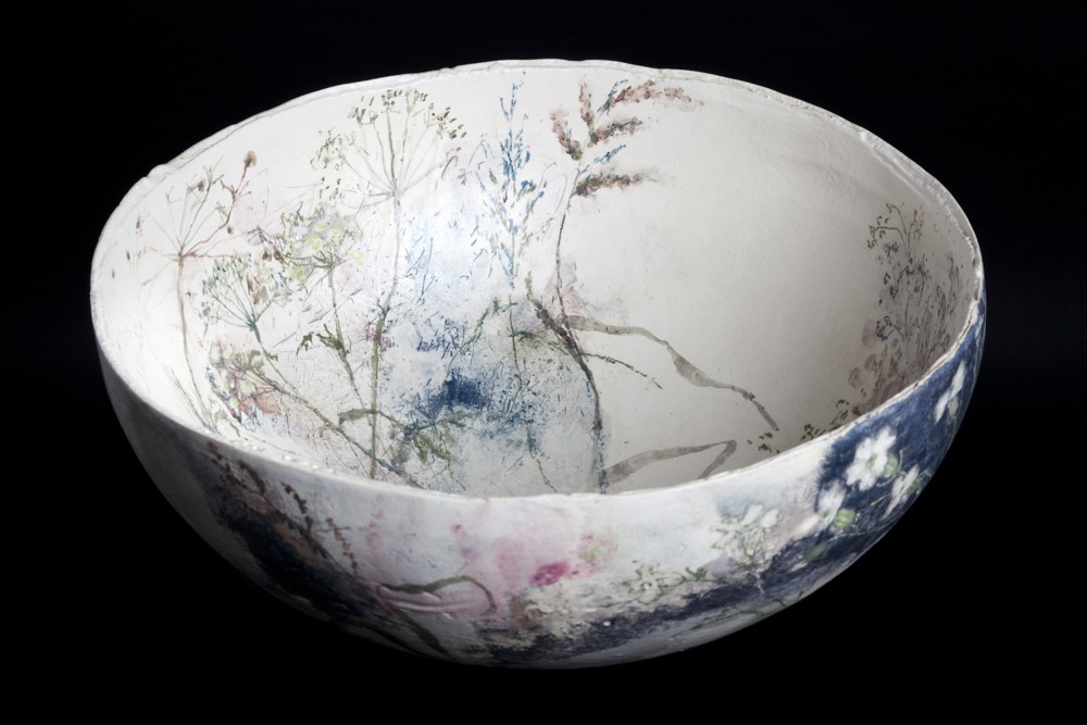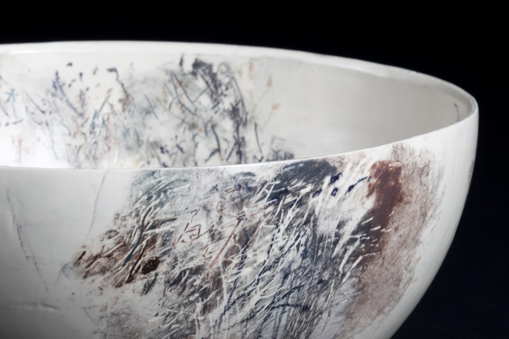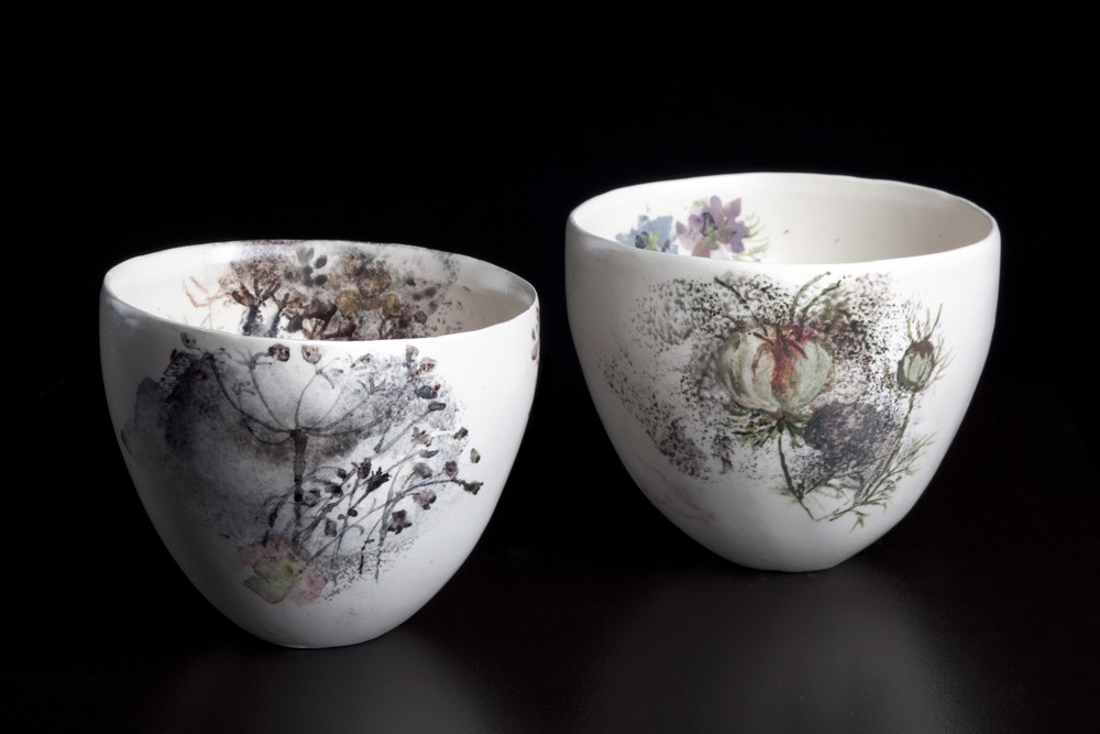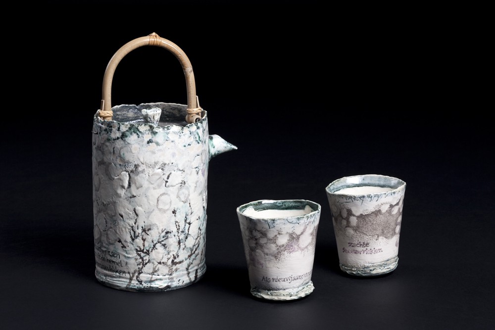 Nicoline ziet haar kommen en vazen als perfecte dragers van haar schilderingen (met grafische elementen). Natuur inspireert haar, iedere dag is verschillend met de beweging van de seizoenen en veranderingen van het weer. Haar impressies schildert zij met gekleurde kleislibs op de 'leerharde' huid van haar object.