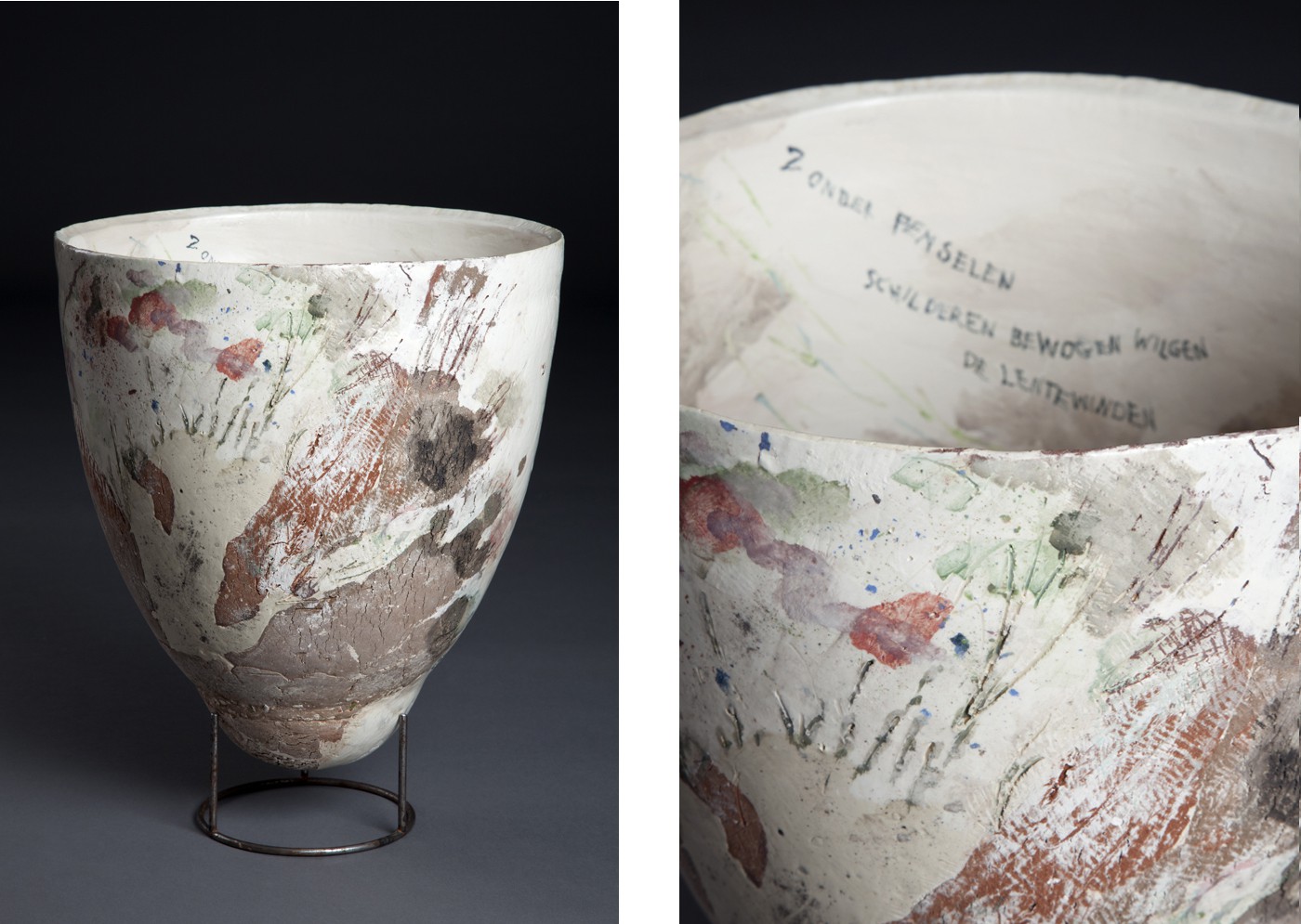 Met het gelaagde gebruik van verschillende soorten rivierklei, scherven en gruis krijgt de huid van het object een weerbarstige structuur. Nicoline wil hiermee haar bezorgdheid over de veranderingen in de natuur en het klimaat tot uiting brengen.