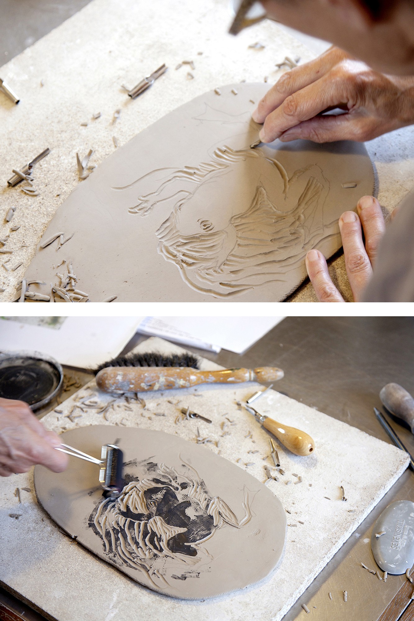 Als keramist beschik ik natuurlijk altijd over klei, dus rolde ik een niet al te grote plaat uit van gladde klei en liet hem iets opstijven. Daarin maakte ik met mijn gutsen de tekening, zonder mijn polsen te belasten. De nog vochtige plaat rolde ik in met inkt en drukte hem af op papier.